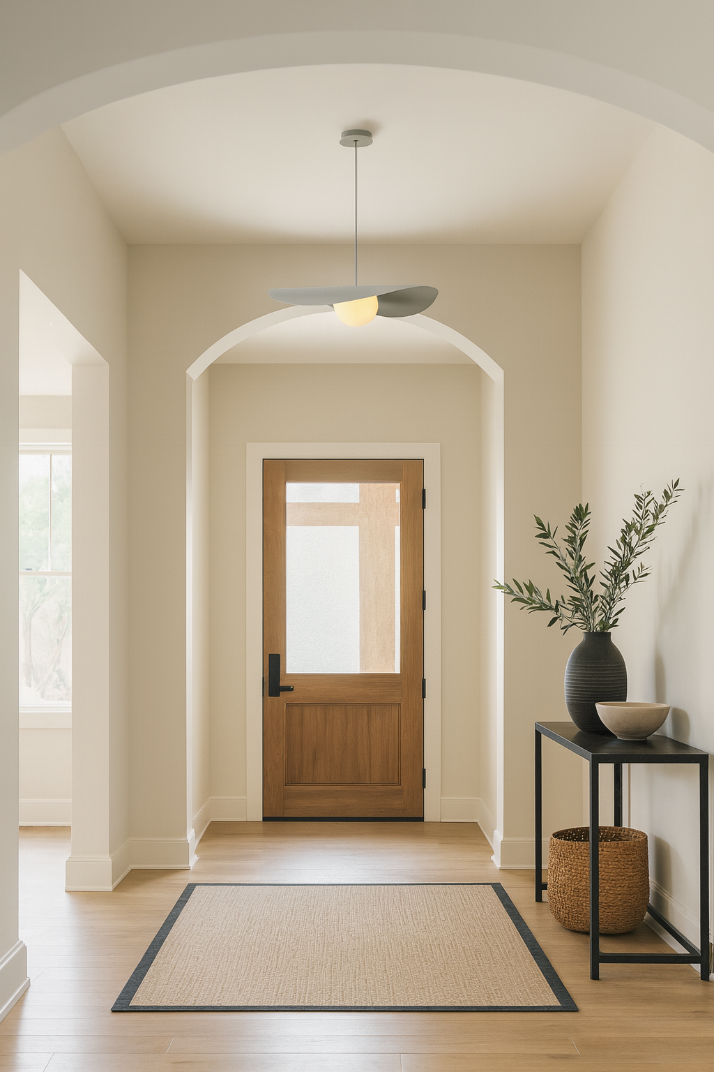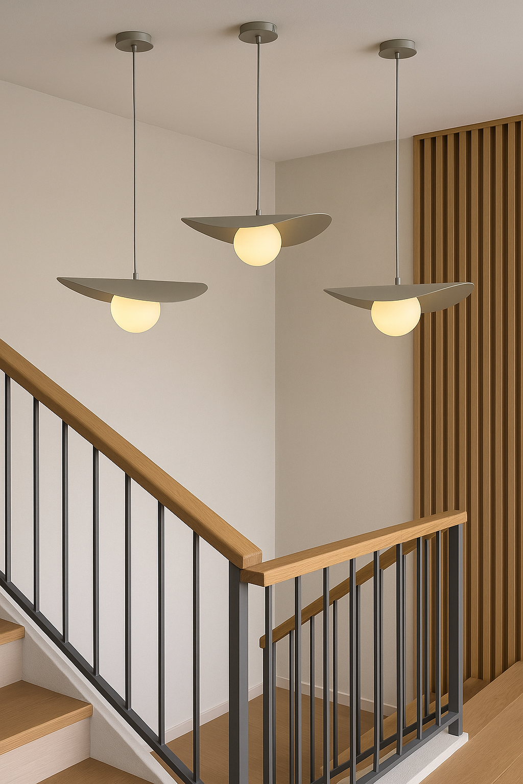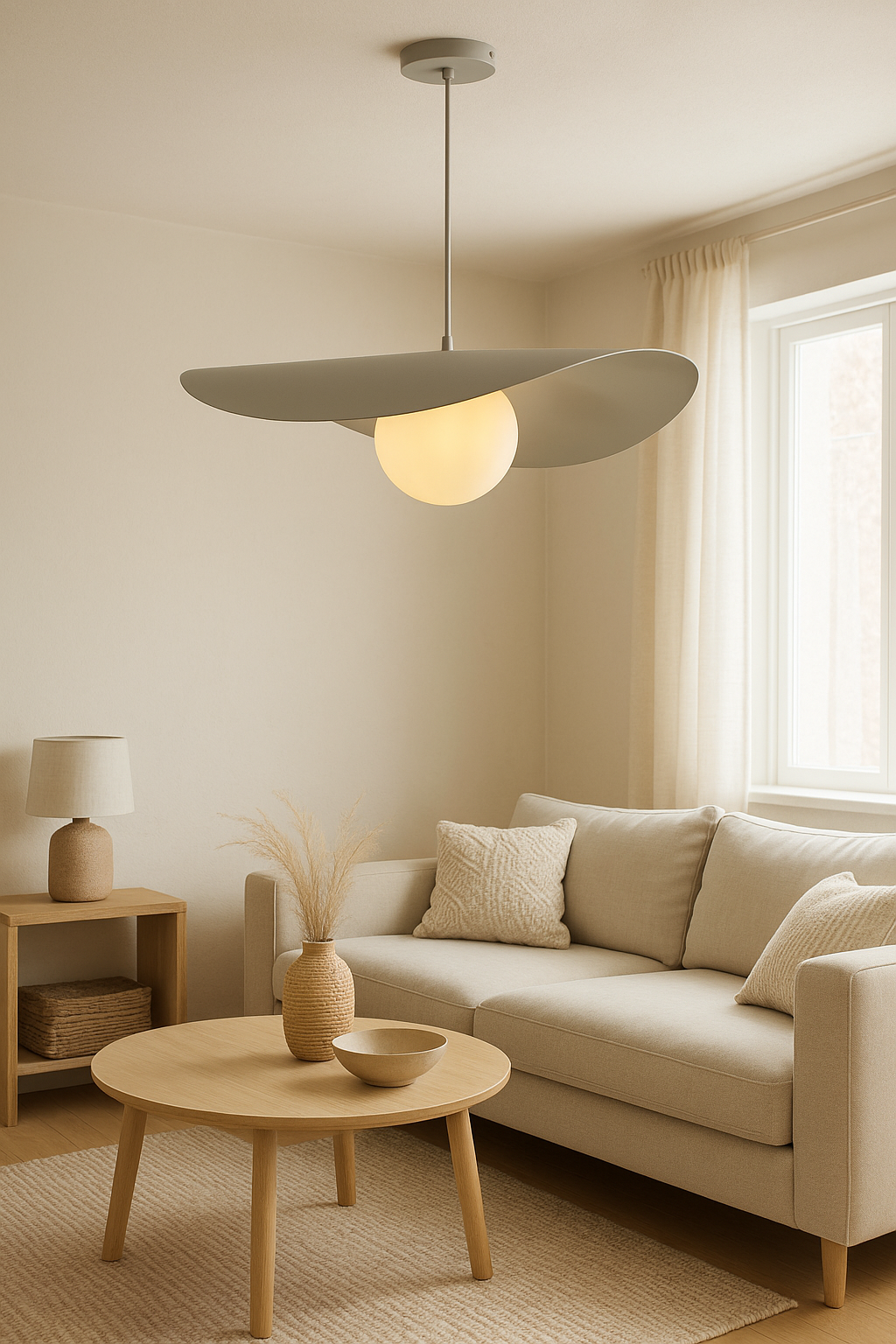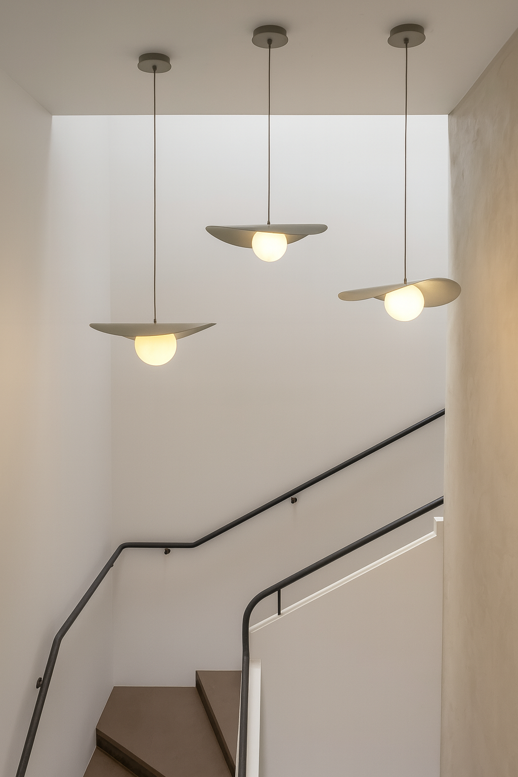 Son disque asymétrique crée un jeu d’ombre et de lumière tout en dissimulant délicatement la source lumineuse, alors que le globe assure un éclairage homogène et sans éblouissement. Épurée mais expressive, cette suspension s’intègre aussi bien aux décors modernes qu’aux intérieurs scandinaves ou contemporains. Parfaite au-dessus d’une table à manger, d’un îlot, dans une cage d’escalier ou en pièce maîtresse du salon.