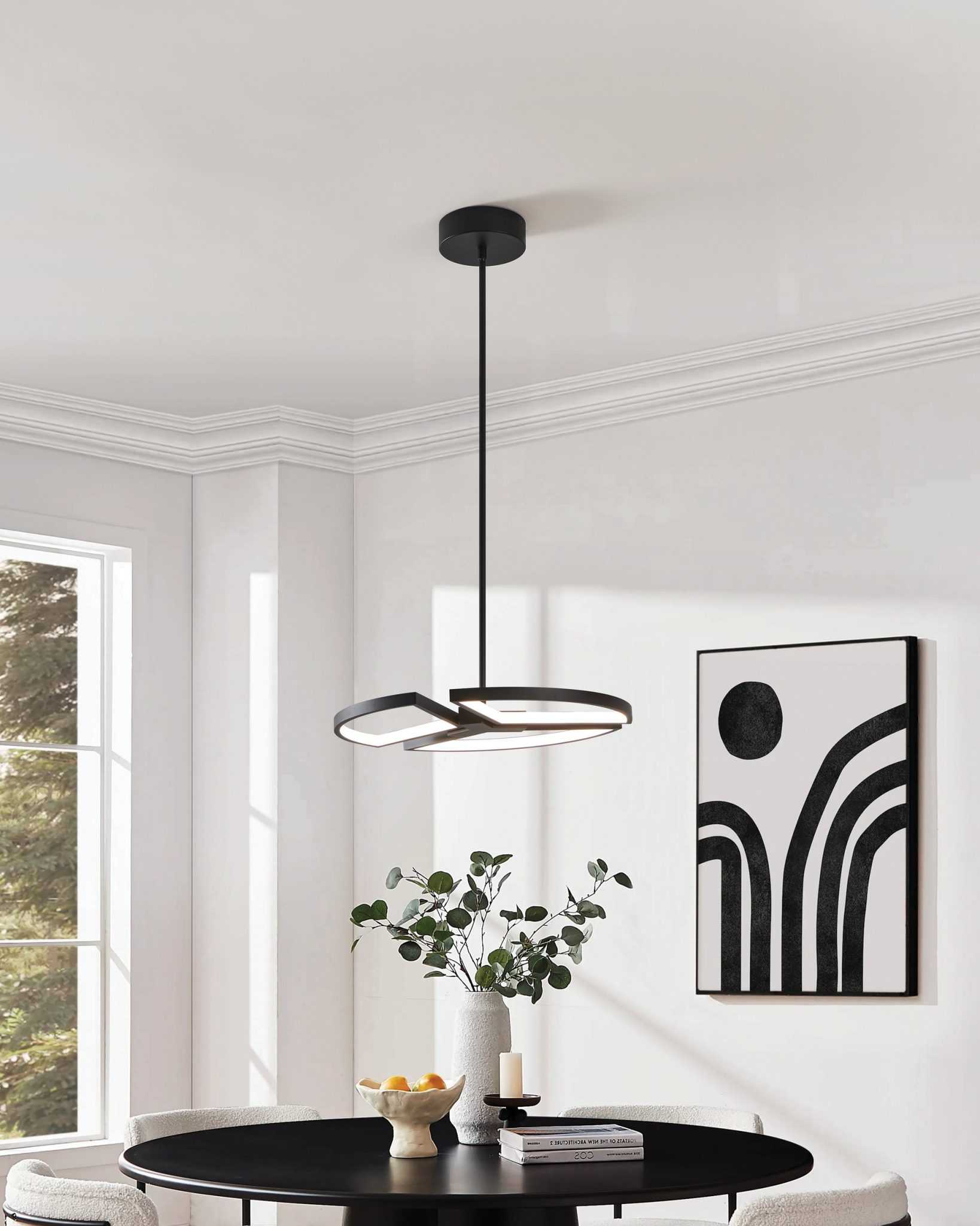 Le lustre Alfie insuffle mouvement et créativité à l’éclairage moderne. Ses formes géométriques imbriquées, en noir texturé, peuvent pivoter afin de remodeler la silhouette et créer une expression de style entièrement personnalisée. Grâce à la technologie DEL intégrée 3CCT, Alfie combine design sculptural et fonctionnalité adaptable, offrant dans un seul luminaire à la fois une présence artistique et une grande polyvalence.