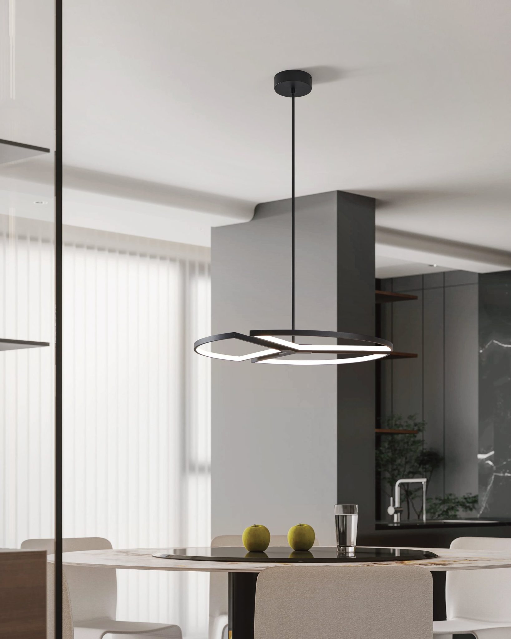 Le lustre Alfie apporte un dynamisme marqué et une touche ludique à l’éclairage contemporain. Ses formes géométriques entrelacées en noir texturé se pivotent pour modifier la silhouette, permettant de composer une configuration à son image. Équipé de la technologie DEL intégrée 3CCT, Alfie marie une conception sculpturale à une fonction hautement adaptable, pour un résultat qui allie art et polyvalence dans une seule pièce maîtresse.