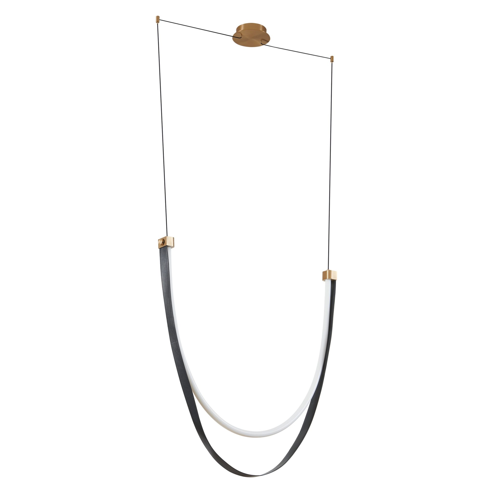 La collection Ayers fait une déclaration audacieuse avec son design spectaculaire à courroies drapées. Les tubes lumineux, dotés de la technologie DEL intégrée 5CCT, sont suspendus entre de larges courroies en faux cuir, alliant texture organique et minimalisme moderne. Offertes en noir ou en brun, les courroies peuvent être utilisées en ton uni ou, sur les modèles à plusieurs courroies, combinées pour créer un contraste saisissant. Des entretoises ajustables permettent de moduler la courbe des boucles, droites ou arrondies, afin d’imprimer au design un mouvement parfaitement sur mesure.