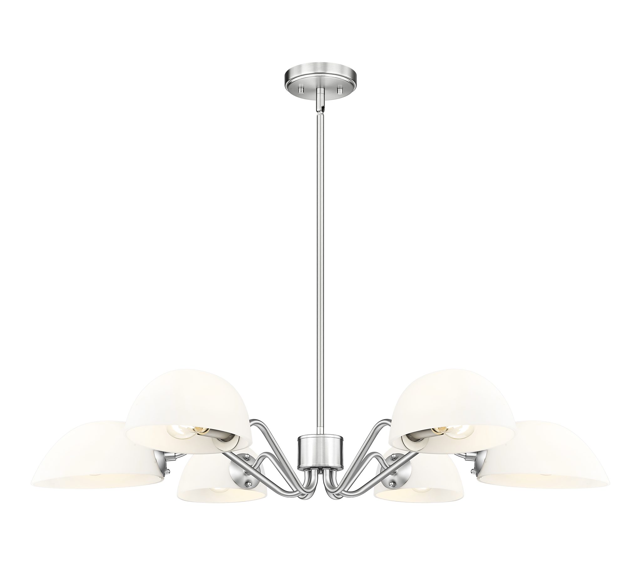 Ce lustre chic à six lumières, aux bras galbés et aux abat-jour en verre opale en forme de dôme, allie modernité et classicisme. Idéal pour le salon et la salle à manger, il offre une grande polyvalence grâce à ses abat-jour orientables permettant de diriger la lumière vers le haut ou vers le bas, selon vos besoins. Sa finition en nickel brossé lui confère un caractère intemporel et un style élégant qui s’intègre harmonieusement à tous les intérieurs.