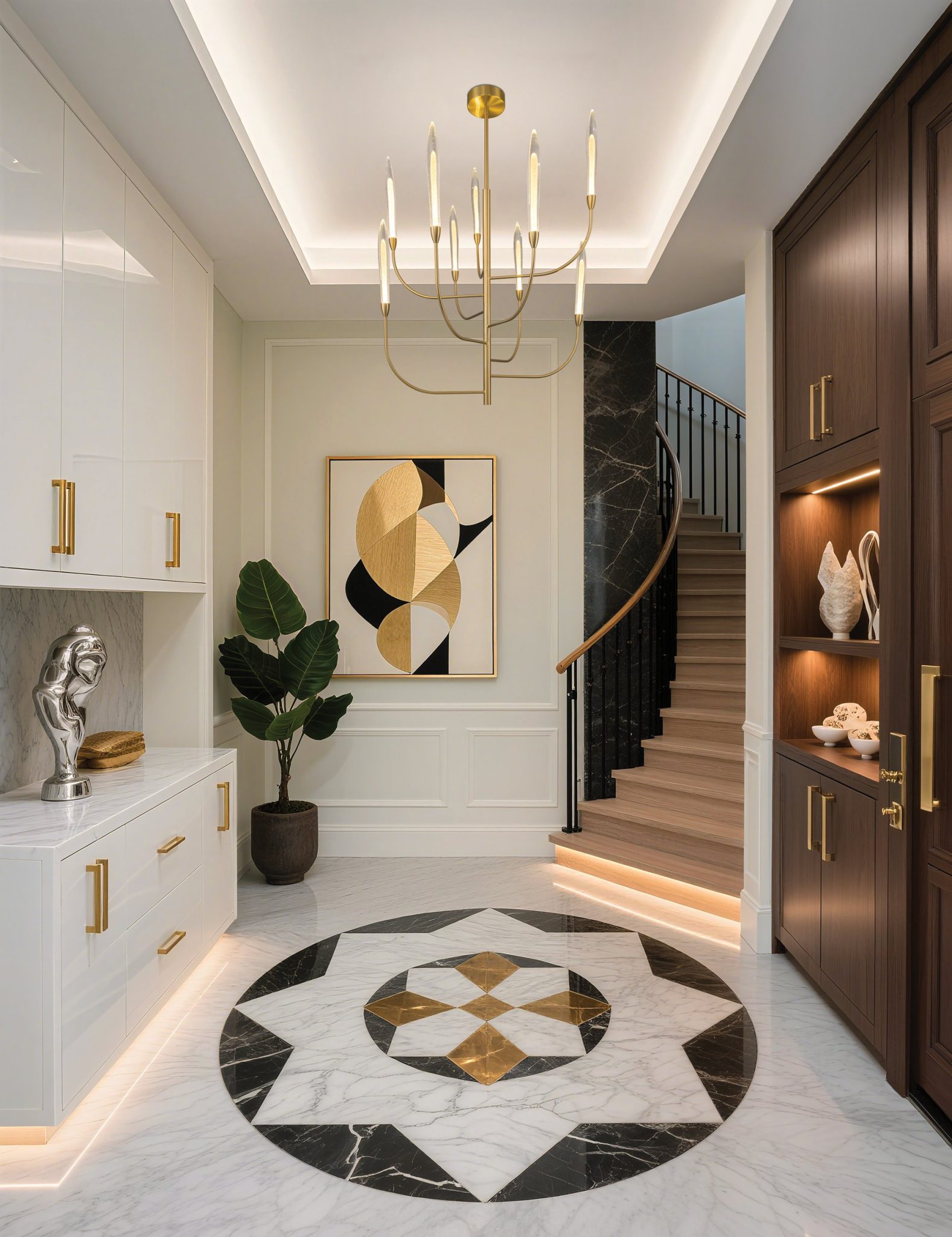 Le lustre Calle évoque la magie d’un décor hivernal, ses abat-jours en verre feuille d’or façonnés à la main prenant la forme de glaçons scintillants lorsqu’ils sont illuminés par des DEL intégrées. Sur une structure asymétrique en laiton dotée de neuf lumières, les bras ajustables permettent de créer une composition lumineuse unique qui marie élégance, personnalité et profondeur.