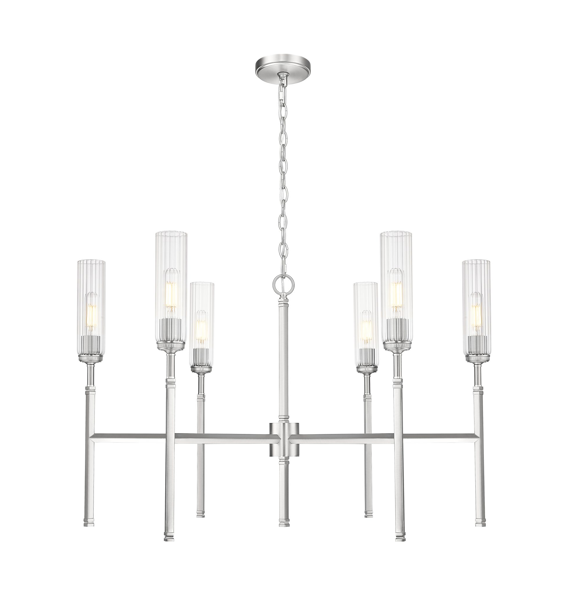 La douce brillance du fini nickel brossé souligne le style épuré et élégant de ce lustre moderne à six lumières. Il associe des abat-jour en verre transparent cannelé à de fines tiges, créant un effet de flûte à champagne qui confère caractère et sophistication à un salon ou une salle à manger. La disposition décalée des lumières crée une silhouette compacte mais très efficace, diffusant une lumière vive sans encombrer l’espace.