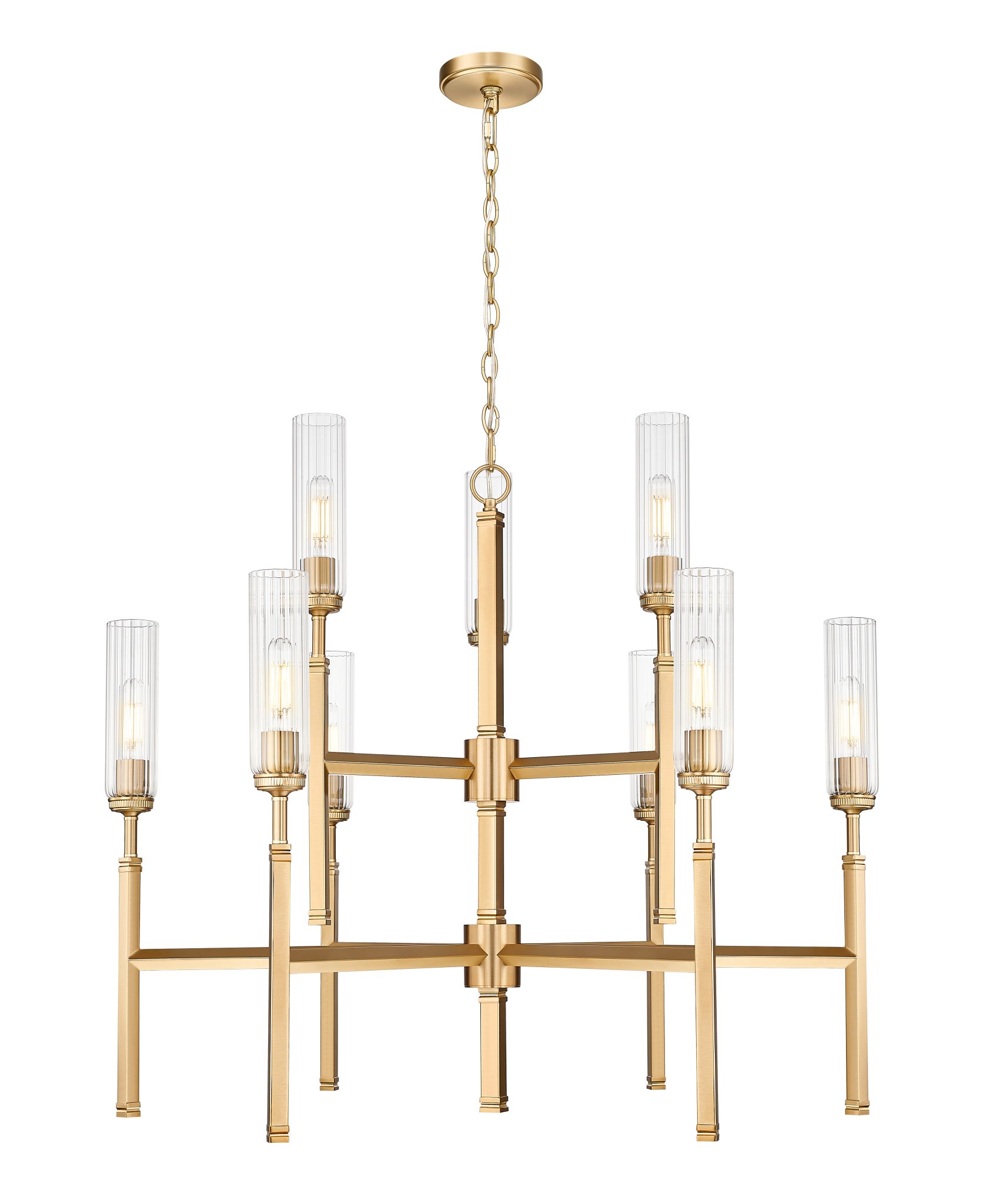 Optez pour le raffinement avec la finition dorée moderne qui orne ce lustre à neuf lumières. Sa silhouette étagée, à la fois audacieuse et compacte, est idéale pour les plafonds voûtés et les escaliers. Les abat-jour en verre cannelé transparent réduisent l’éblouissement pour une ambiance exceptionnelle et reposent sur de fines tiges qui lui confèrent une élégance et un caractère inspirés du champagne.