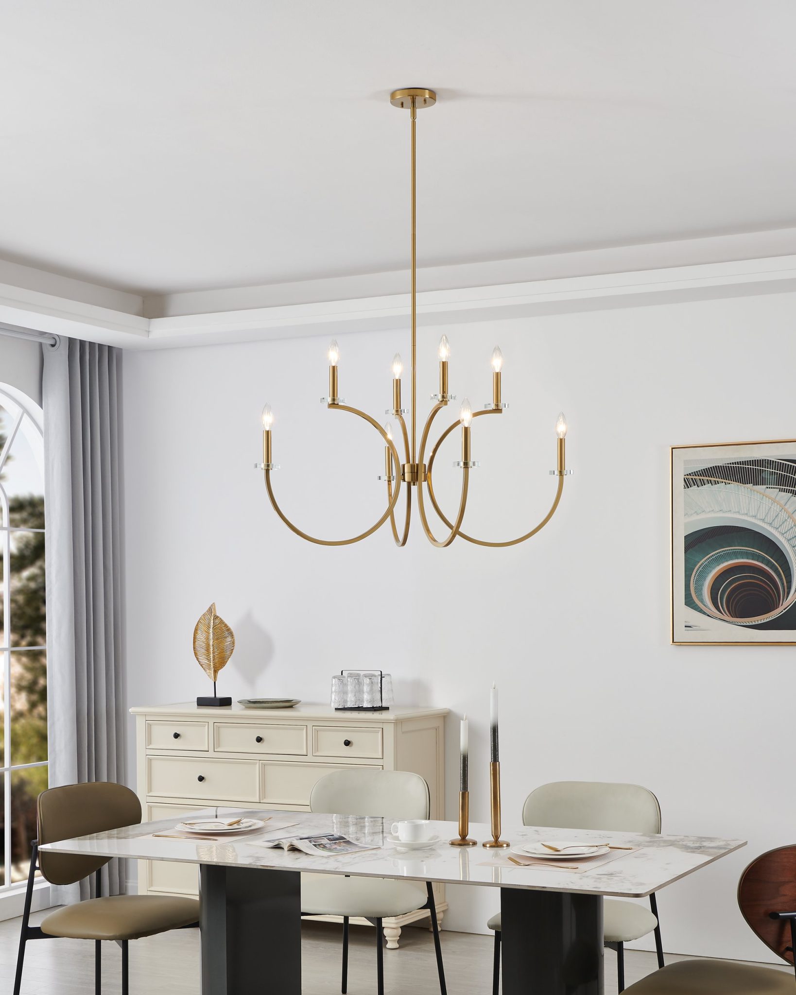 Le lustre Florian exprime une élégance intemporelle grâce à sa silhouette inspirée de la calligraphie, où de minces bras en or brossé s’incurvent avec douceur pour soutenir des lumières de style chandelier. Des bobèches en verre clair ajoutent une touche d’éclat et peuvent être retirées pour obtenir un look plus épuré, permettant à Florian de passer aisément d’une beauté classique à un luxe moderne.