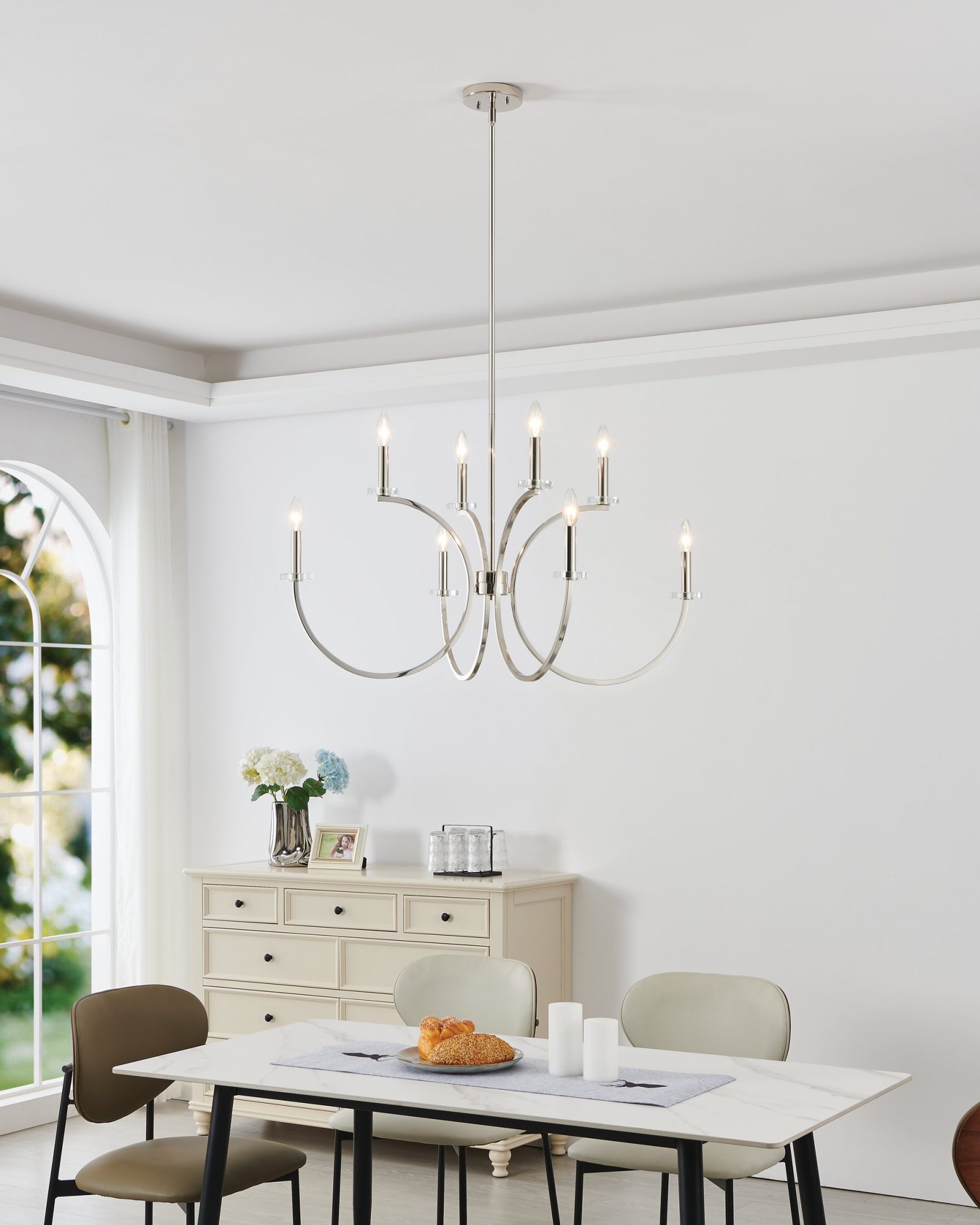 Le lustre Florian exprime une élégance intemporelle grâce à sa silhouette inspirée de la calligraphie, où de minces bras s’incurvent avec douceur pour soutenir des lumières de style chandelier. Des bobèches en verre clair épais ajoutent une touche d’éclat et peuvent être retirées pour un look plus minimaliste. La silhouette traditionnelle actualisée de Florian dégage une élégance moderne et luxueuse.