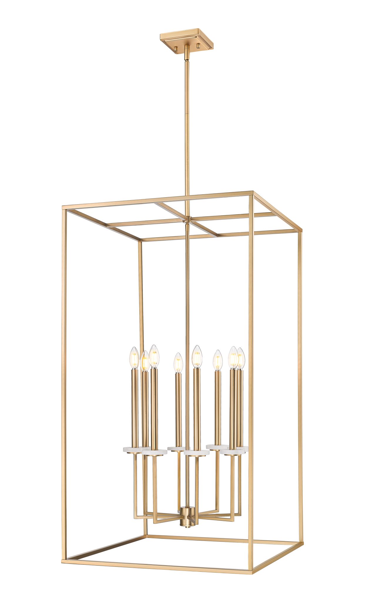 Ce lustre à huit lumières, aux lignes épurées et inspiré d’une cage géométrique, allie avec élégance style ancien et moderne et sublime salles à manger, halls d’entrée et salons. Sa structure métallique ajourée, en acier doré, abrite un ensemble de douilles pour ampoules de type candélabre. Des bobèches décoratives apportent une touche de charme supplémentaire et permettent de moduler l’intensité lumineuse pour créer l’ambiance souhaitée.