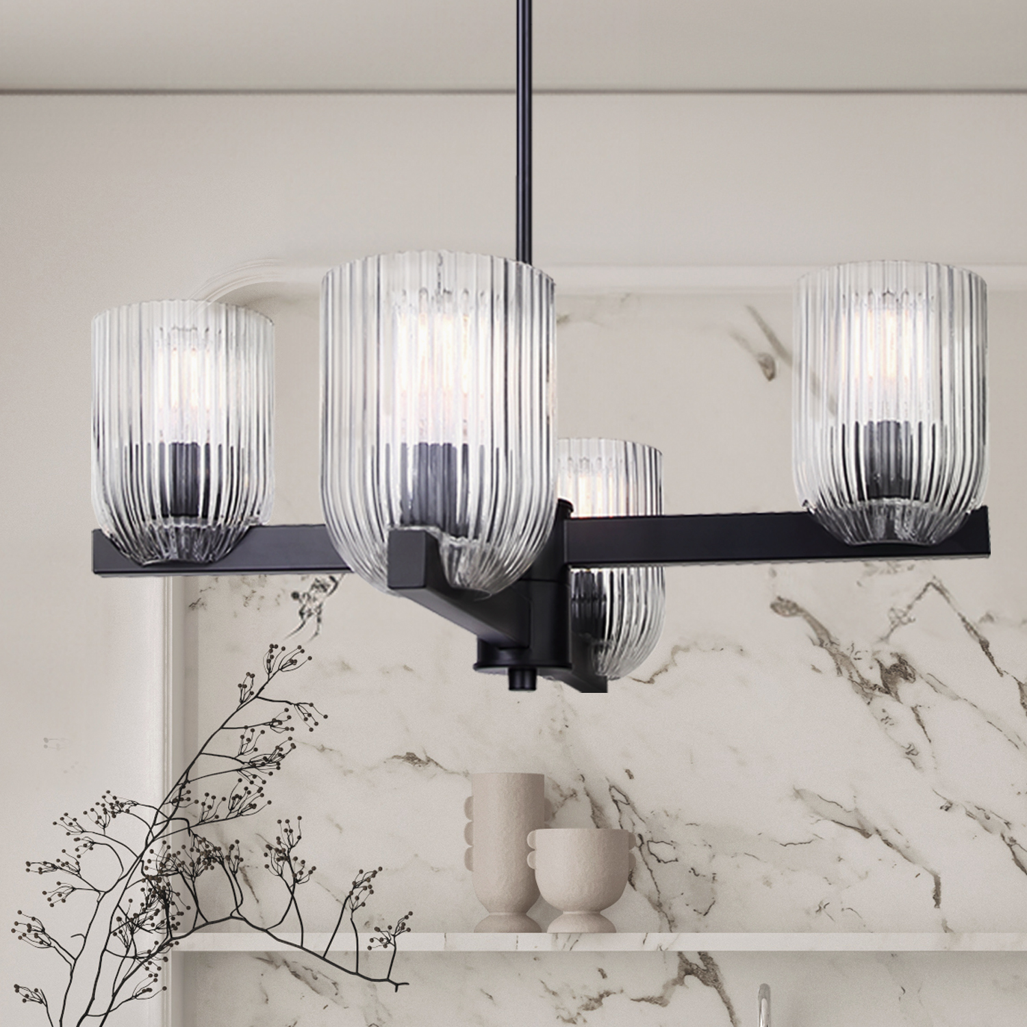 Le lustre RENZO allie une présence affirmée à un luxe discret, avec sa structure noire mate et ses abat-jour en verre transparent côtelé. Doté de quatre sources de lumière, il offre un équilibre parfait entre robustesse et raffinement, diffusant une lumière à la fois saisissante et chaleureuse. Les détails côtelés du verre ajoutent texture et relief, complétant la finition noire lisse pour un effet à la fois contemporain et intemporel. Mesurant 58,4 cm de large et réglable de 43,8 à 150,5 cm, RENZO s’intègre facilement dans les salles à manger, les salons ou les entrées. Conçu pour quatre ampoules de 60 W de type A, ce lustre est une pièce maîtresse pour les intérieurs modernes et éclectiques.