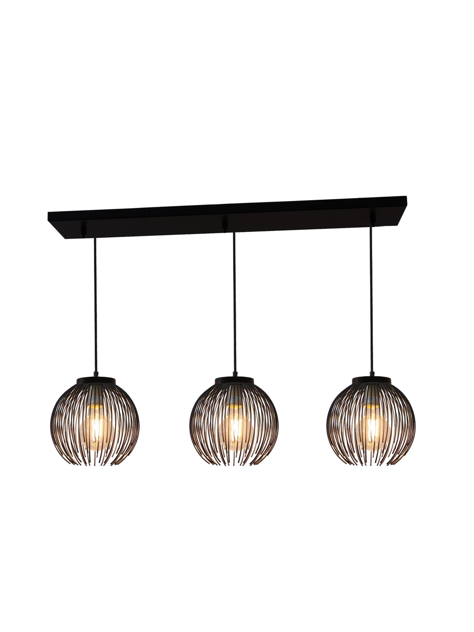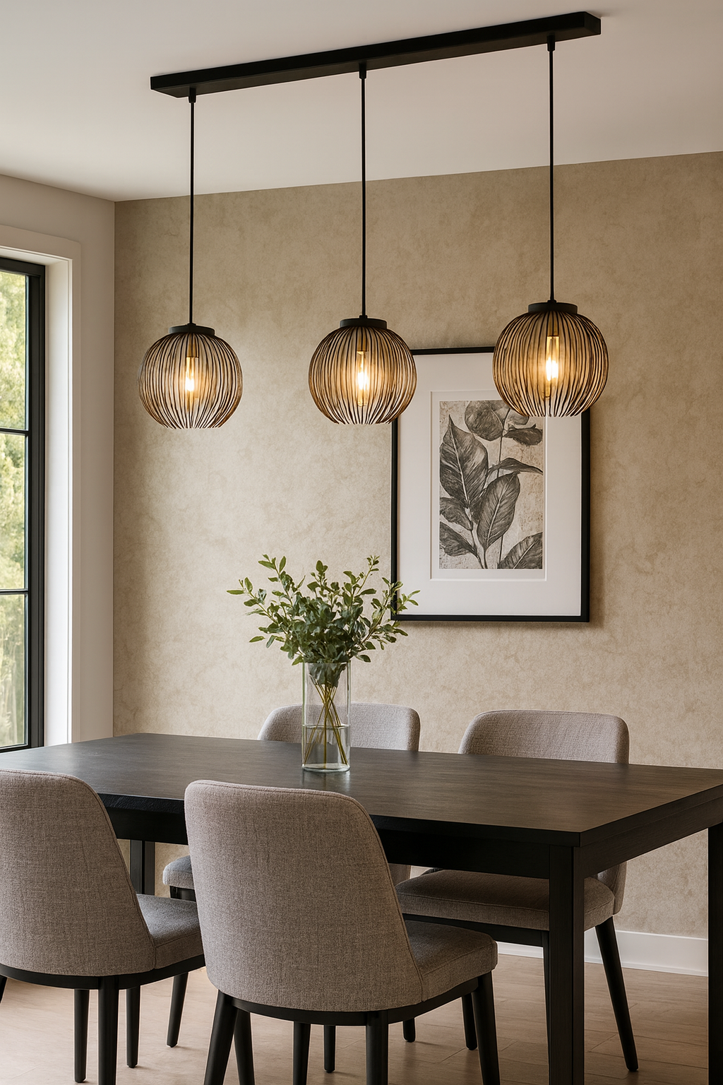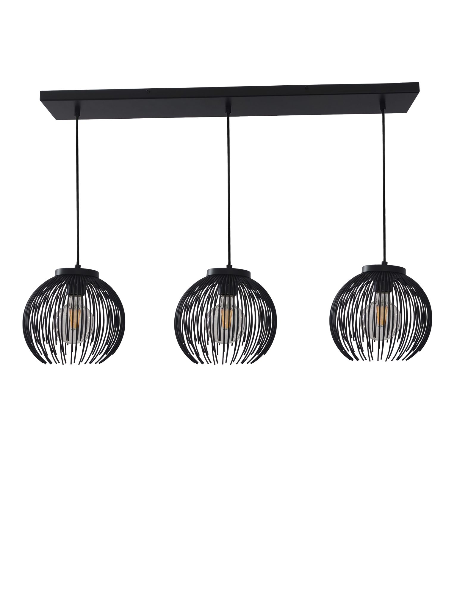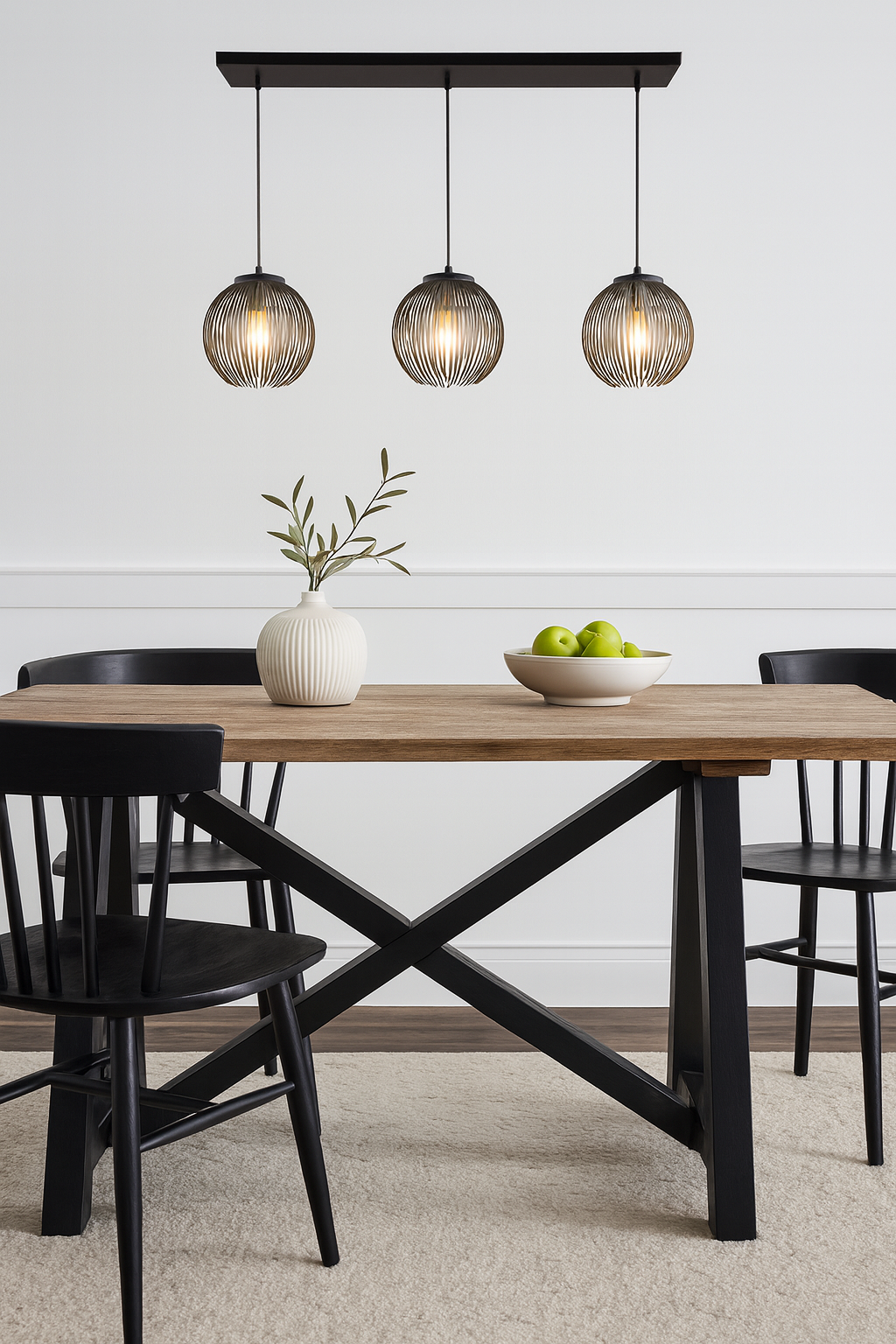 Graphique et aérienne, cette suspension à trois abat-jours sphériques en tiges métalliques offre une présence sculpturale sans alourdir l’espace. La lumière se diffuse à 360° à travers les courbes, créant de subtils jeux d’ombres au-dessus d’un îlot, d’une table de salle à manger ou d’un comptoir.