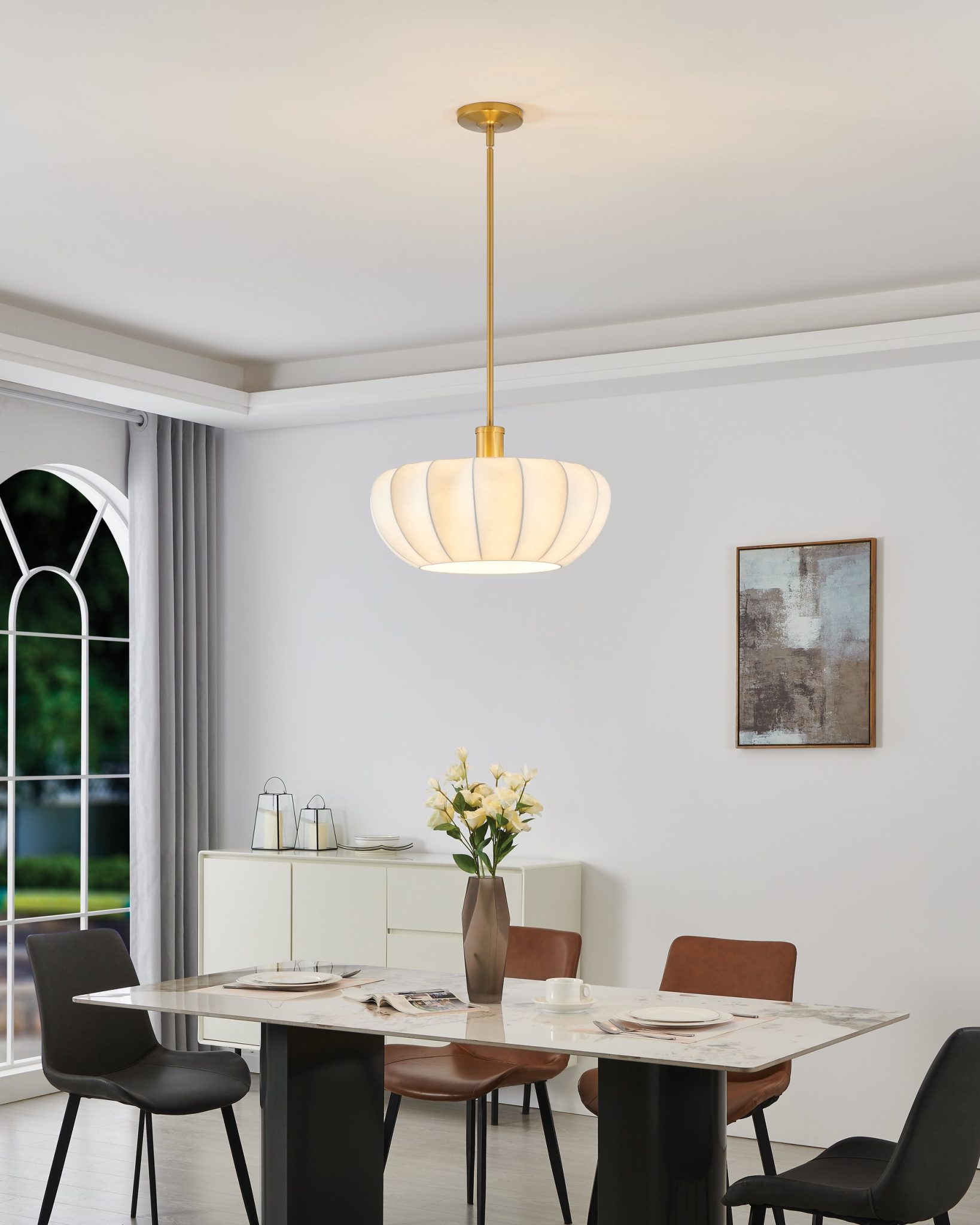 Le luminaire suspendu Bryony insuffle une élégance organique aux décors contemporains grâce à sa silhouette doucement arrondie et à son fini or brossé. Inspiré par la grâce des lanternes japonaises du milieu du siècle dernier, ses abat-jours en soie synthétique blanche diffusent la lumière en une lueur chaude et sereine qui enveloppe l’espace. Pensé pour la polyvalence, ce luminaire suspendu convertible peut être installé en suspension ou en semi-plafonnier, mariant un design intemporel à un confort résolument moderne. Conçu pour s’intégrer harmonieusement à tout environnement.