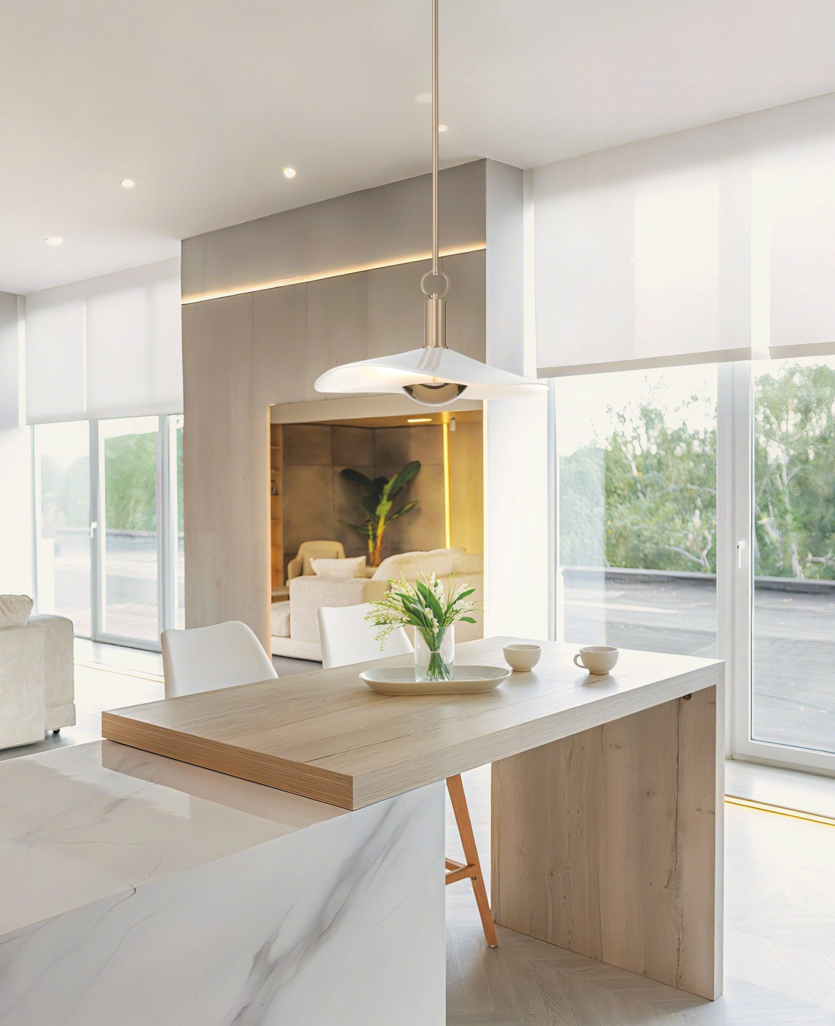Le luminaire suspendu convertible Novella unit finesse sculpturale et chaleur sophistiquée. Sa large coupole en céramique blanche coulée à la main, inspirée par les courbes naturelles des nénuphars, est mise en valeur par une finition or polie qui évoque équilibre et fluidité. Sous l’abat-jour, une source DEL intégrée projette une douce lueur ascendante qui accentue sa silhouette gracieuse et la qualité de son savoir-faire.