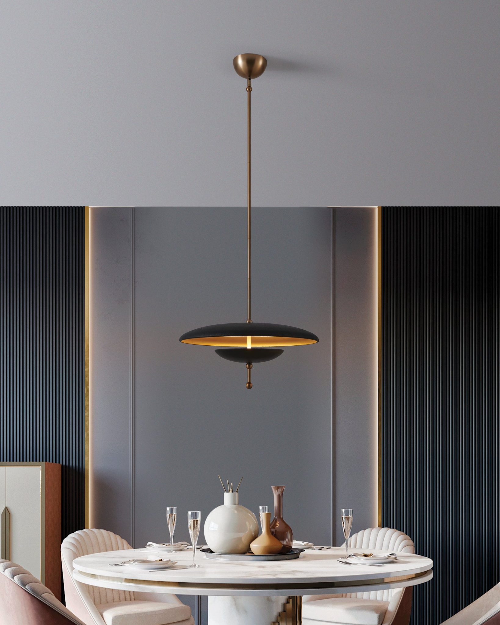 Le luminaire suspendu convertible Sinclair exprime un luxe moderne grâce à l’alliance riche du faux cuir noir et de l’or champagne. Sa silhouette épurée présente un abat-jour doucement bombé avec un éclairage DEL 5CCT intégré, projetant une lueur ascendante à l’intérieur doré pour en révéler toute la richesse. Inspirée du milieu du siècle dernier et dotée d’une texture raffinée, Sinclair apporte une ambiance feutrée et sophistiquée à tout espace.