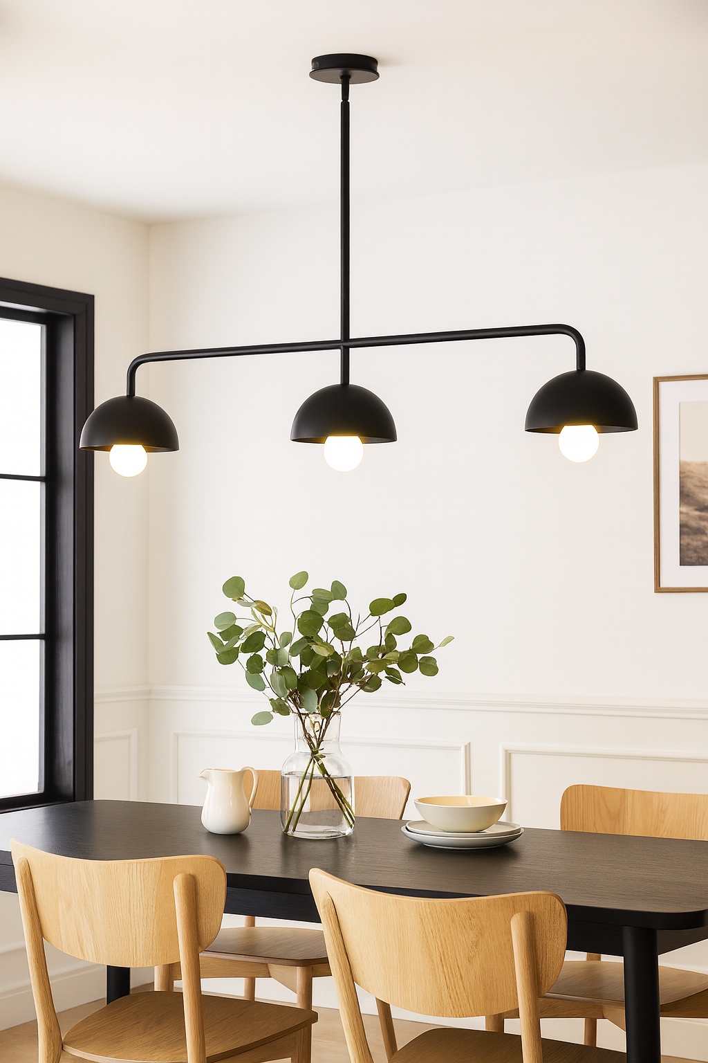 Ce luminaire au style minimaliste, rehaussé par une structure métallique aux lignes droites et équilibrées, s’intègre harmonieusement autant dans un décor contemporain que scandinave ou classique. Parfait pour créer une ambiance accueillante dans la salle à manger, au-dessus d’un îlot de cuisine ou même dans un espace de travail.