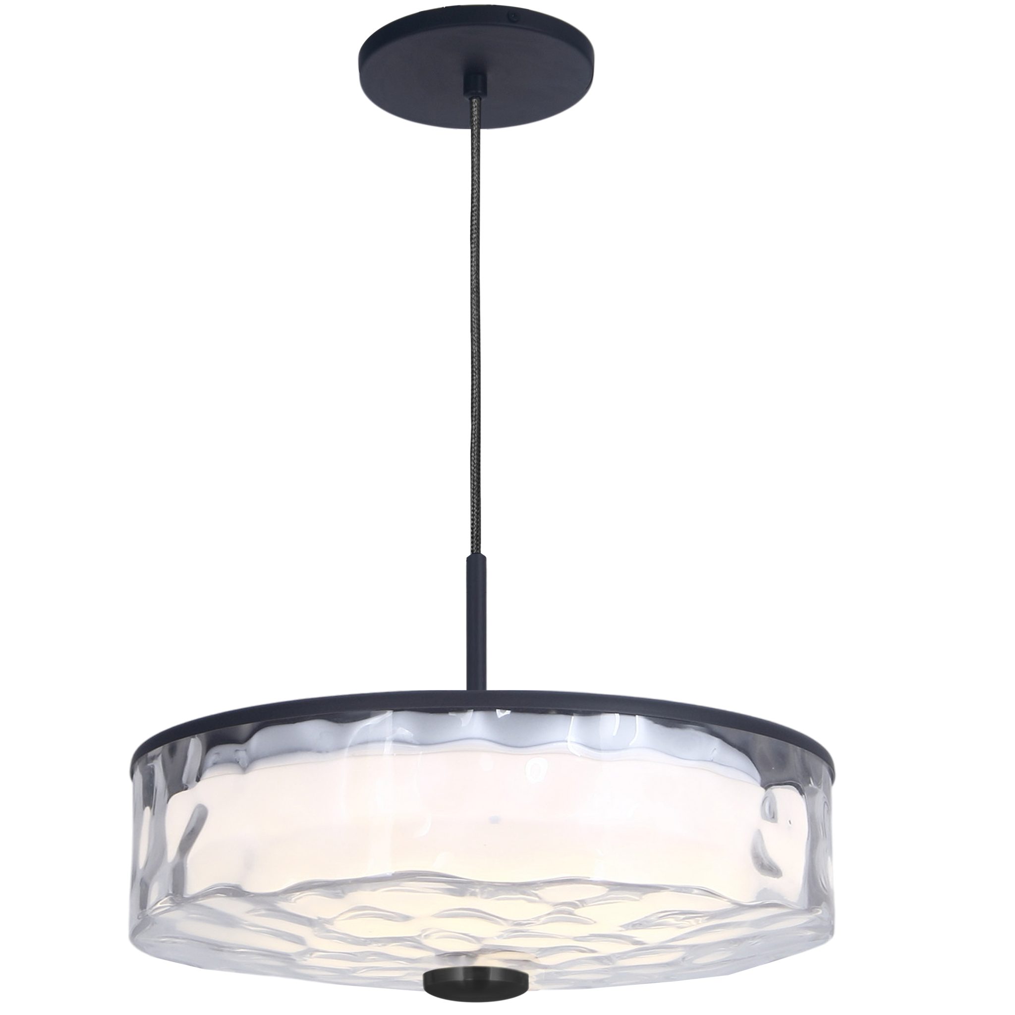 Découvrez DULCE Luminaire suspendu DEL, fini noir mat avec verre clair ondulé, 15po Diamètre, 3,5po Hauteur, 76,5po Hauteur max., 30W DEL 900 Lumens, 3000K