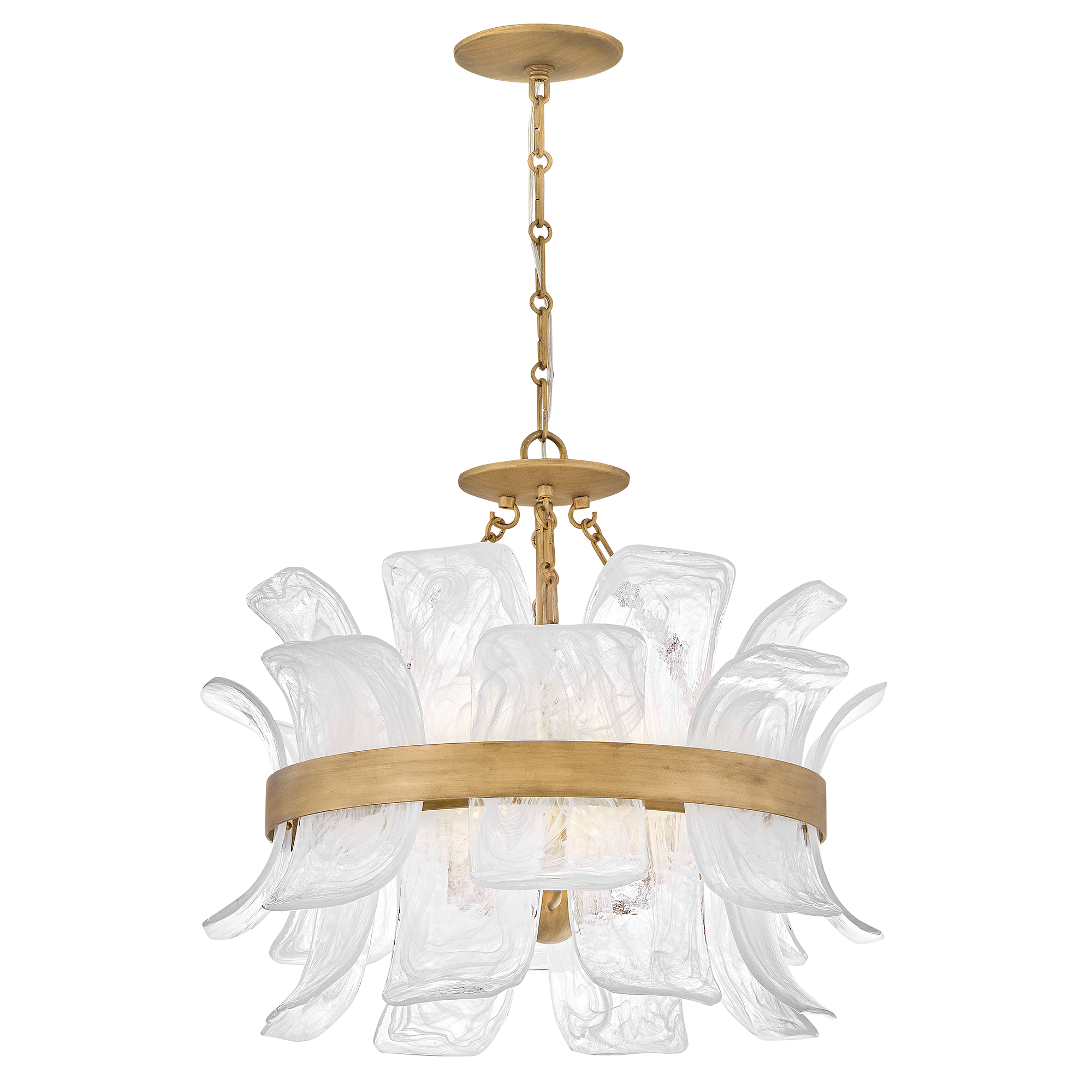 Des feuilles de verre tourbillonnant, habilement posées et agencées avec art, semblent se déployer depuis la magnifique silhouette cylindrique de Fleur, rehaussée d’une bande centrale peinte à la main en or bruni. Des couches blanches, semblables à des nuages, diffusent doucement la lumière chaleureuse des candélabres, créant une atmosphère enchanteresse.