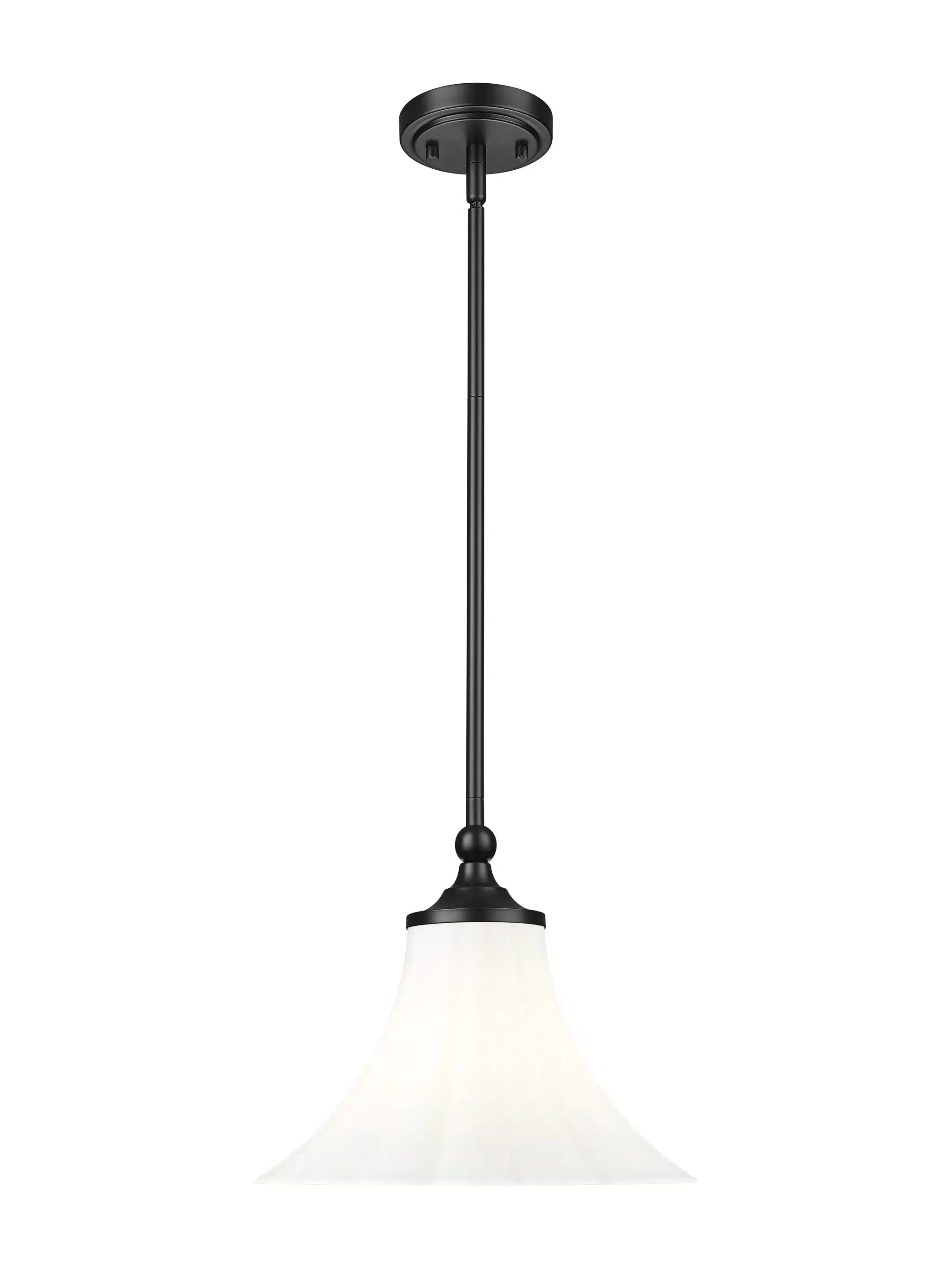 La structure en métal noir mat, audacieuse et élégante, contraste avec le luminaire suspendu à une seule lumière, un choix exceptionnel pour de nombreux espaces de vie. L’abat-jour en verre opale mat cannelé évoque le romantisme et une esthétique délicate. Son éclairage à intensité variable réchauffe les entrées et les salons, ou peut être installé en rangée pour illuminer les espaces horizontaux, comme les îlots de cuisine.