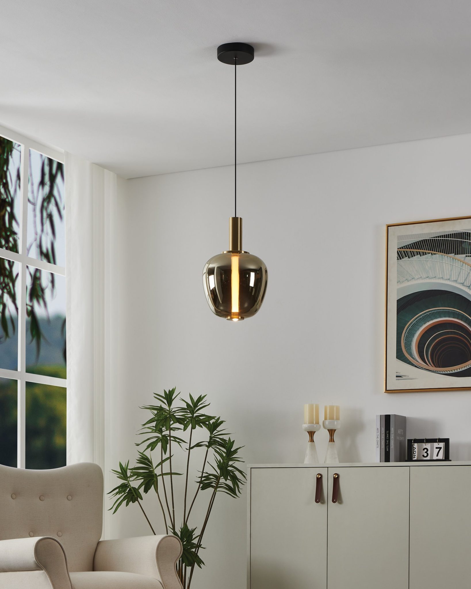 Le luminaire suspendu DEL Fruitera de 10 pouces est un accent raffiné qui marie un fini noir et or brossé à un abat-jour en verre fumé doré profond. Éteint, le verre présente une surface lisse et miroir, révélant une profondeur métallique chaleureuse. Une fois allumé, un diffuseur interne en acrylique dissimulé émerge délicatement, dévoilant un cœur lumineux qui transforme entièrement son apparence. Cet effet superposé crée dimension et contraste subtil entre le verre réfléchissant et la lumière adoucie. Doté d’une hauteur de suspension ajustable et de la technologie DEL 3CCT intégrée, il permet de personnaliser facilement sa présence verticale ainsi que la chaleur de son éclat afin de s’harmoniser parfaitement à votre espace.