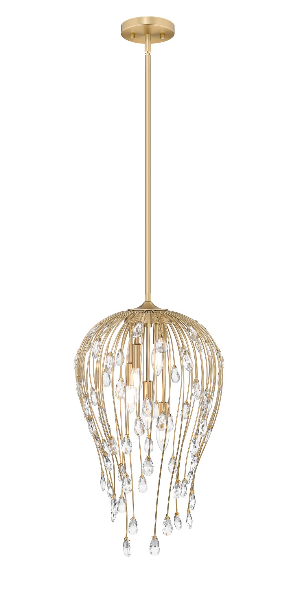 Avec ses formes délicates, cette suspension à cinq lumières en métal ajouré offre un rendu visuel harmonieux. Une trouvaille éblouissante, empreinte de douceur organique et de glamour. Illuminez n’importe quel espace d’une lumière élégante : ses tiges métalliques dorées modernes sculptent une silhouette de poire inversée, tandis que des éléments en cristal, tels des bourgeons, reflètent la lumière et créent une ambiance unique dans un salon, un hall d’entrée ou une chambre.