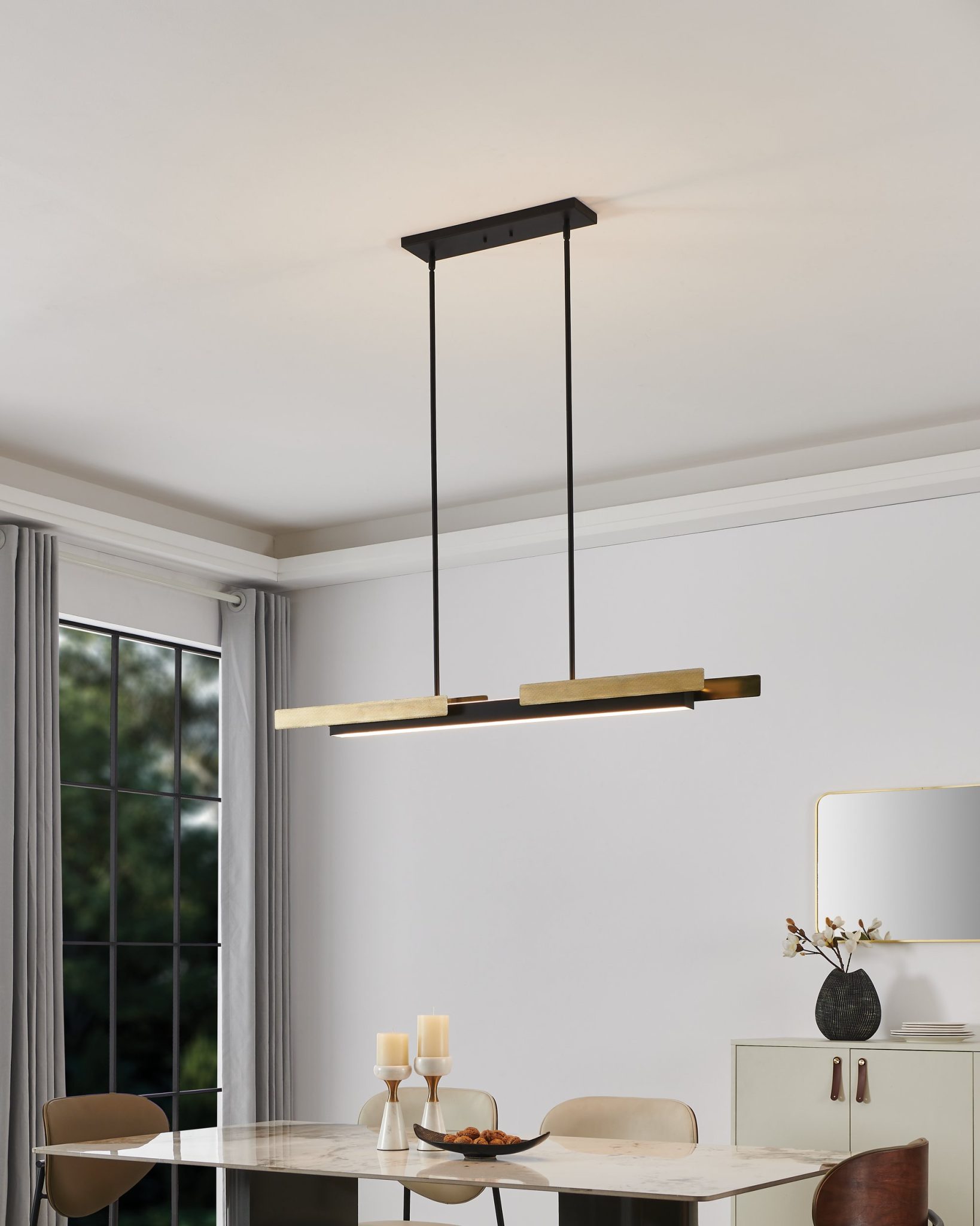 Le lustre linéaire Grazia incarne l’élégance du design joaillier moderne allié à la force de l’artisanat industriel. Des panneaux en noir mat et en or brossé sont superposés sur son cadre allongé, révélant un fin moletage qui ajoute une profondeur tactile. Doté d’une source DEL intégrée diffusant la lumière vers le haut et vers le bas, Grazia crée une présence sculpturale saisissante au-dessus d’une table, d’un îlot ou d’un espace de travail.