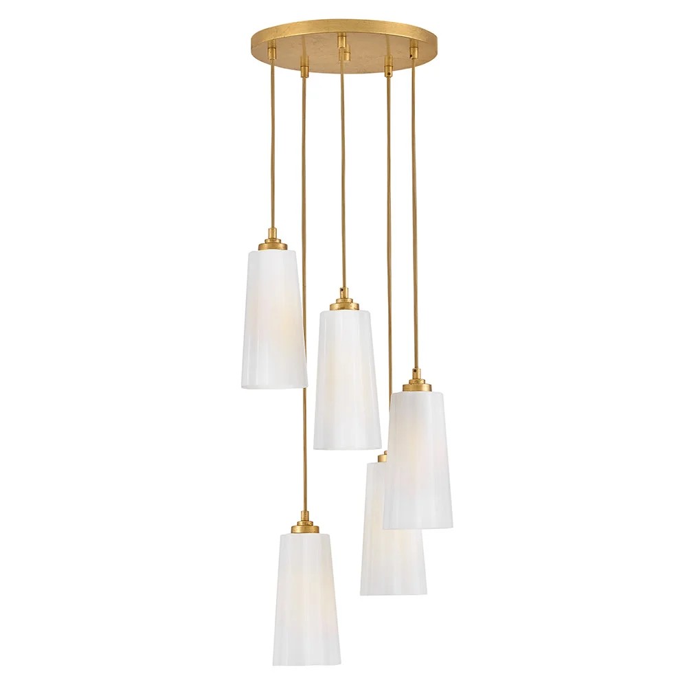 Découvrez HONEY Luminaire suspendu fini laiton laqué avec verres opales, 16po Diamètre, 46,3po Hauteur, 70,25po Hauteur max., 5 x 10W DEL E26