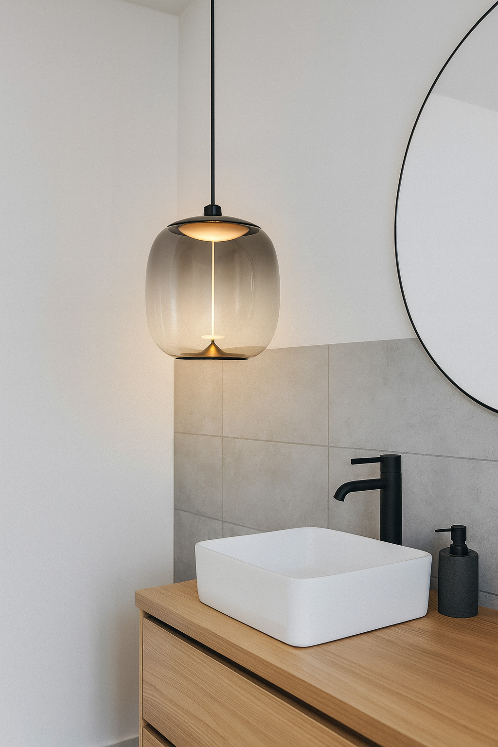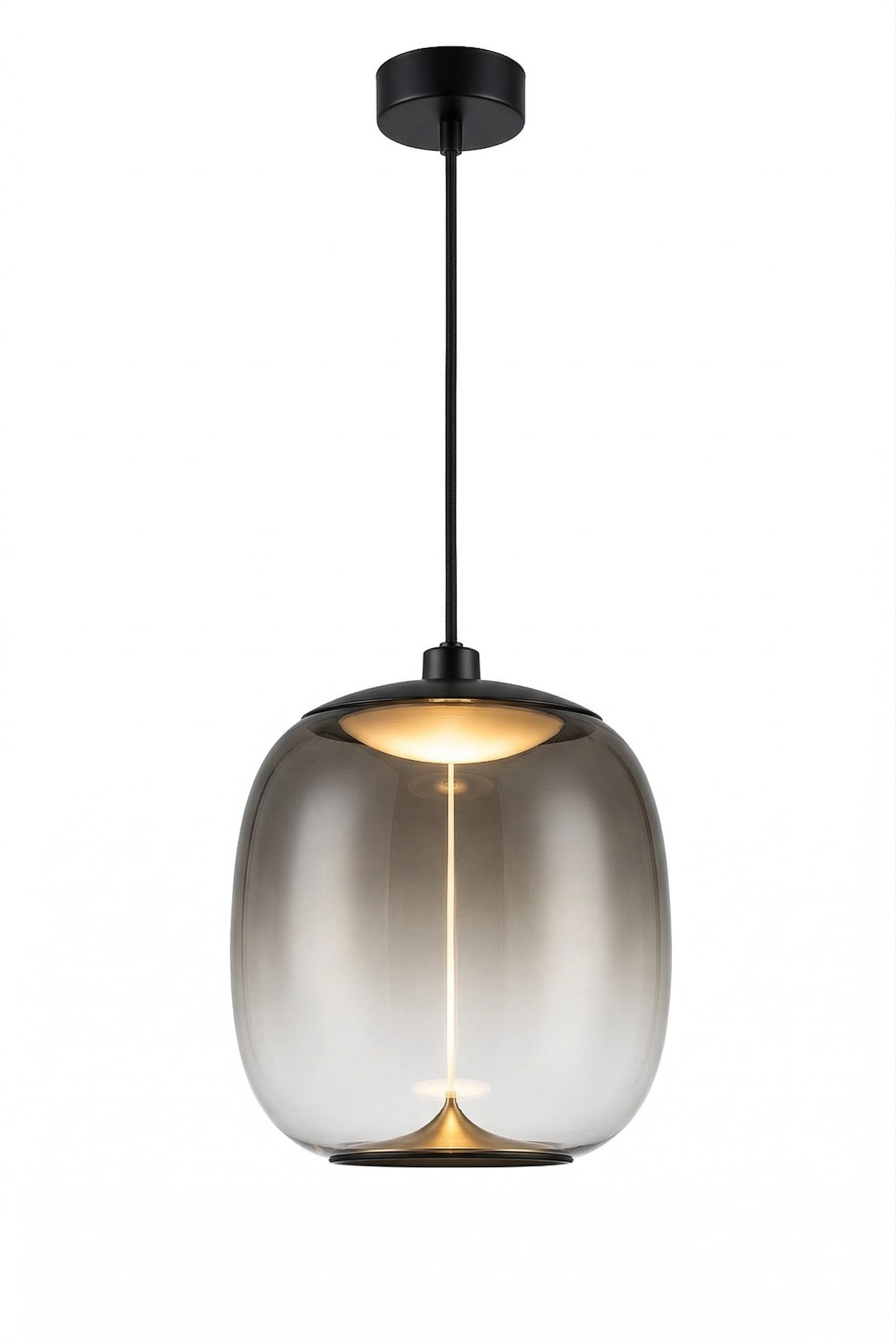 Découvrez le Luminaire suspendu avec ampoule avec finition du haut et du bas noire, section principale fini fumé, 7,87po Diamètre, 14,56po Hauteur, 300 Lumens, 12 W, 3000K