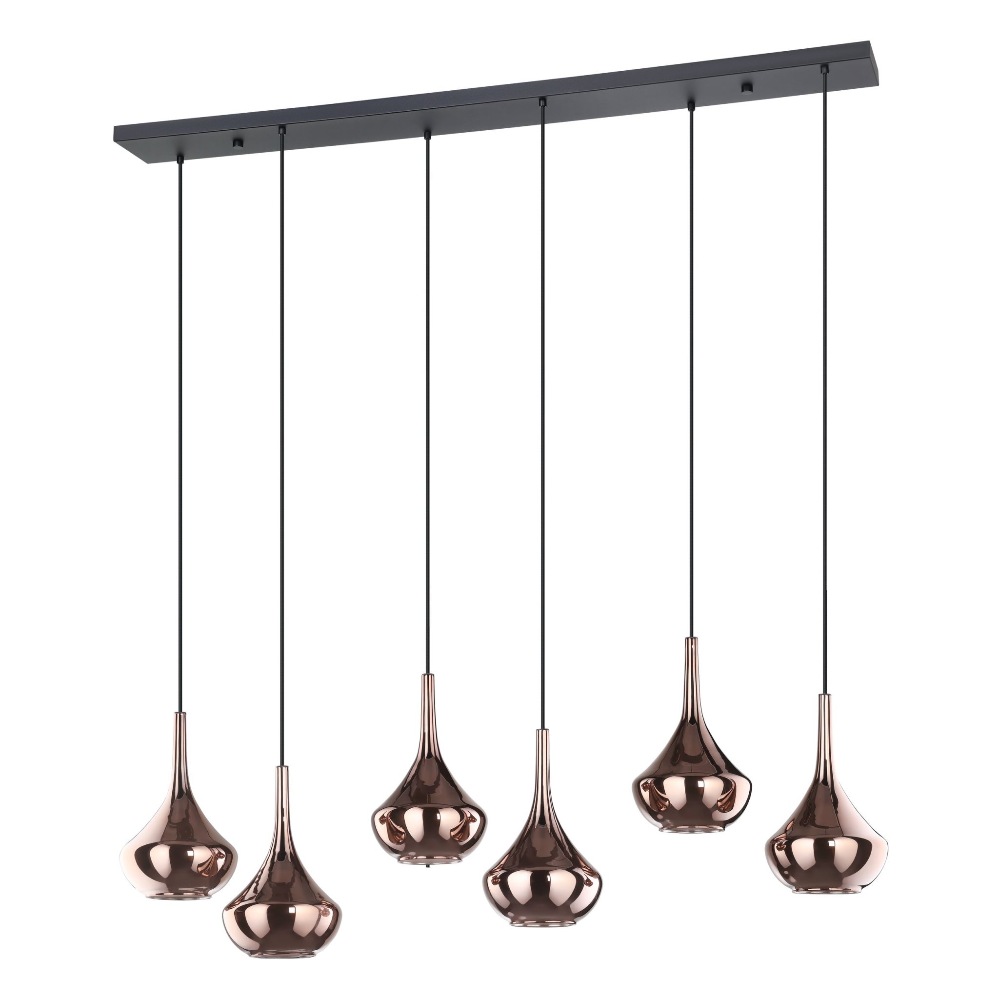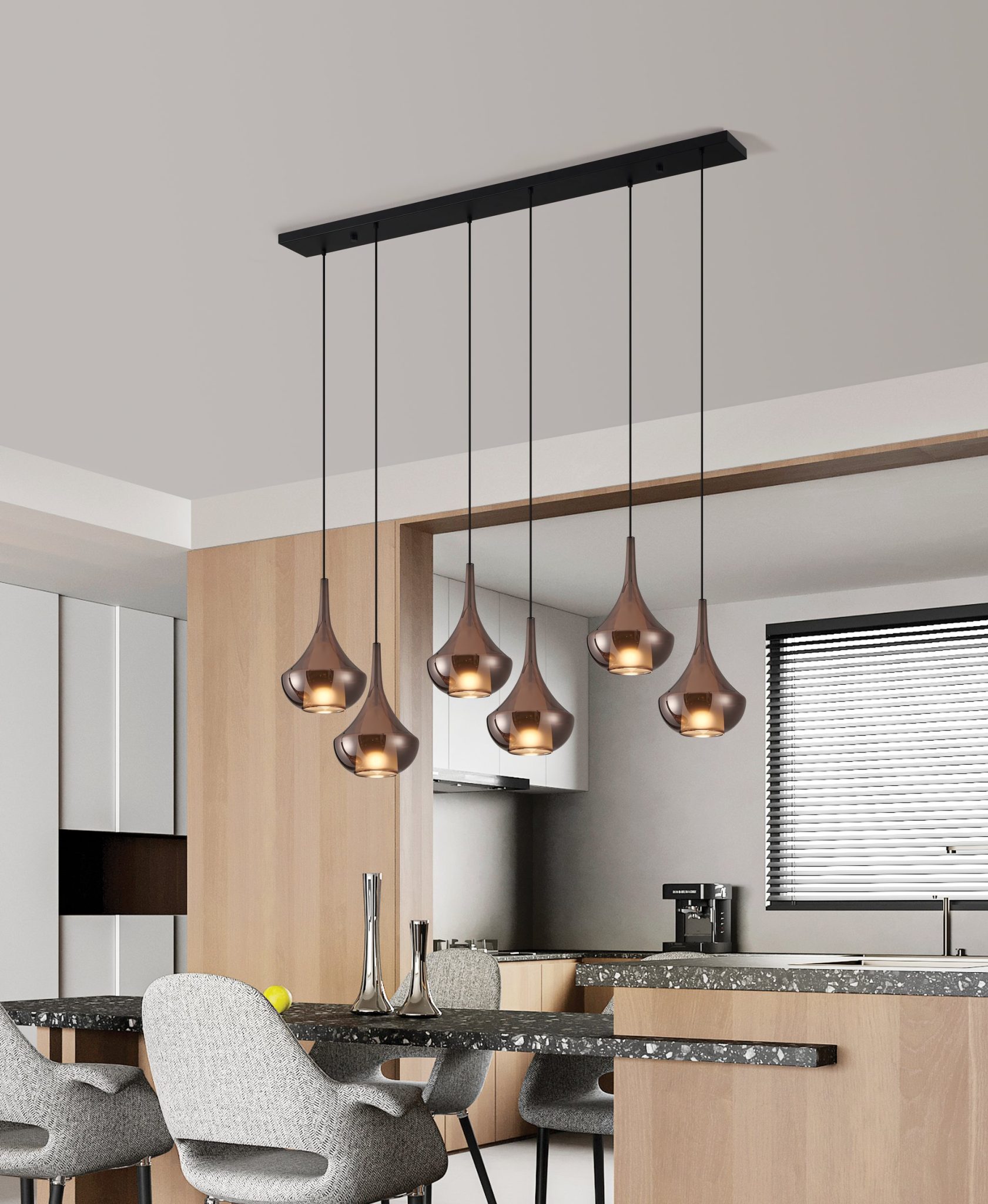 Le luminaire suspendu linéaire Almoster met en valeur une superposition raffinée de matériaux dans une composition spectaculaire de six abat-jours en verre en forme de goutte suspendues le long d’une canopée noire épurée. Chaque abat-jour est fabriqué à partir de deux éléments en verre distincts réunis dans un design fluide et harmonieux. Le verre extérieur présente une riche teinte cuivrée au fini miroir qui reflète son environnement lorsqu’il est éteint. Une fois allumé, le verre intérieur délicatement givré se révèle de l’intérieur, diffusant la lumière et créant un cœur lumineux chaleureux au sein de chaque forme. Suspendue à des hauteurs décalées, cette composition à six lumières apporte profondeur lumineuse et rythme élégant au-dessus d’une table de salle à manger, d’un îlot de cuisine ou dans un espace de vie moderne.