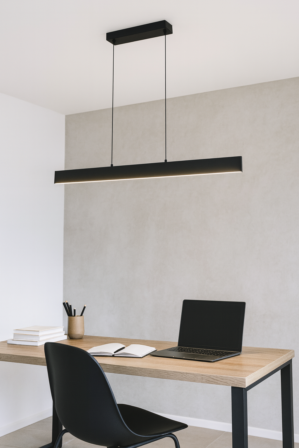Élégante et contemporaine, cette suspension linéaire offre un éclairage uniforme et moderne, parfait pour les espaces de vie, de travail ou les aires de repas. Suspendu par deux câbles discrets, ce luminaire offre un design épuré, qui apporte une touche sophistiquée tout en maximisant la diffusion de lumière.