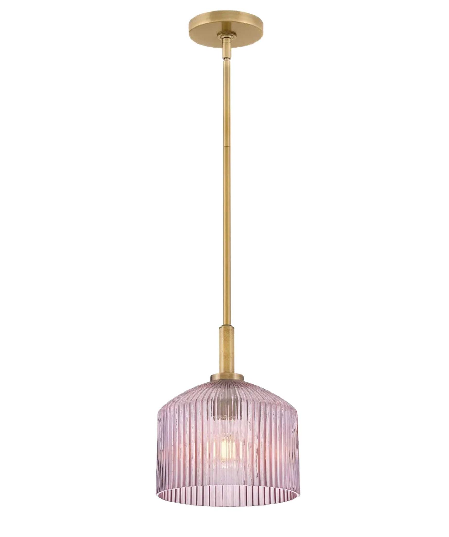 Découvrez LISETTE Luminaire suspendu fini laiton laqué avec verre rose nervuré, 9po Diamètre, 10,75po Hauteur, 44po Hauteur max., 1 x 12W DEL E26