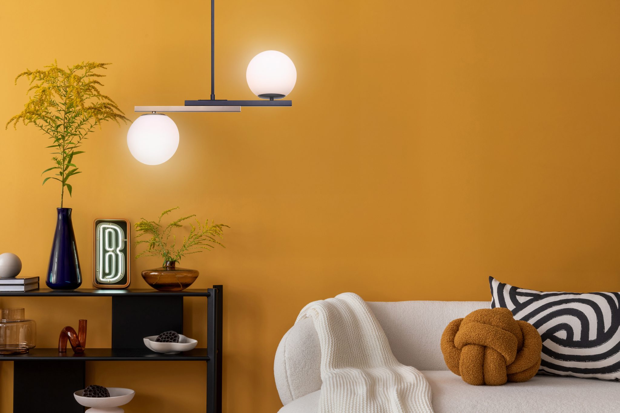 La suspension LUMI à deux lumières incarne l’essence du design moderne avec une touche vintage. Sa structure sculpturale associe des finitions noir mat et or chaud, et se distingue par un globe plat en verre opale à chaque extrémité. Cet équilibre parfait crée une symétrie et diffuse une lumière douce et tamisée, sublimant salles à manger, cuisines ou salons d’une élégance contemporaine. Réglable en hauteur de 61 à 153 cm et d’une largeur de 60 cm, la suspension LUMI s’adapte à différentes hauteurs de plafond. Conçue pour deux ampoules de type C de 60 W, elle allie un style d’inspiration vintage à un luxe accessible, pour un luminaire élégant et affirmé.