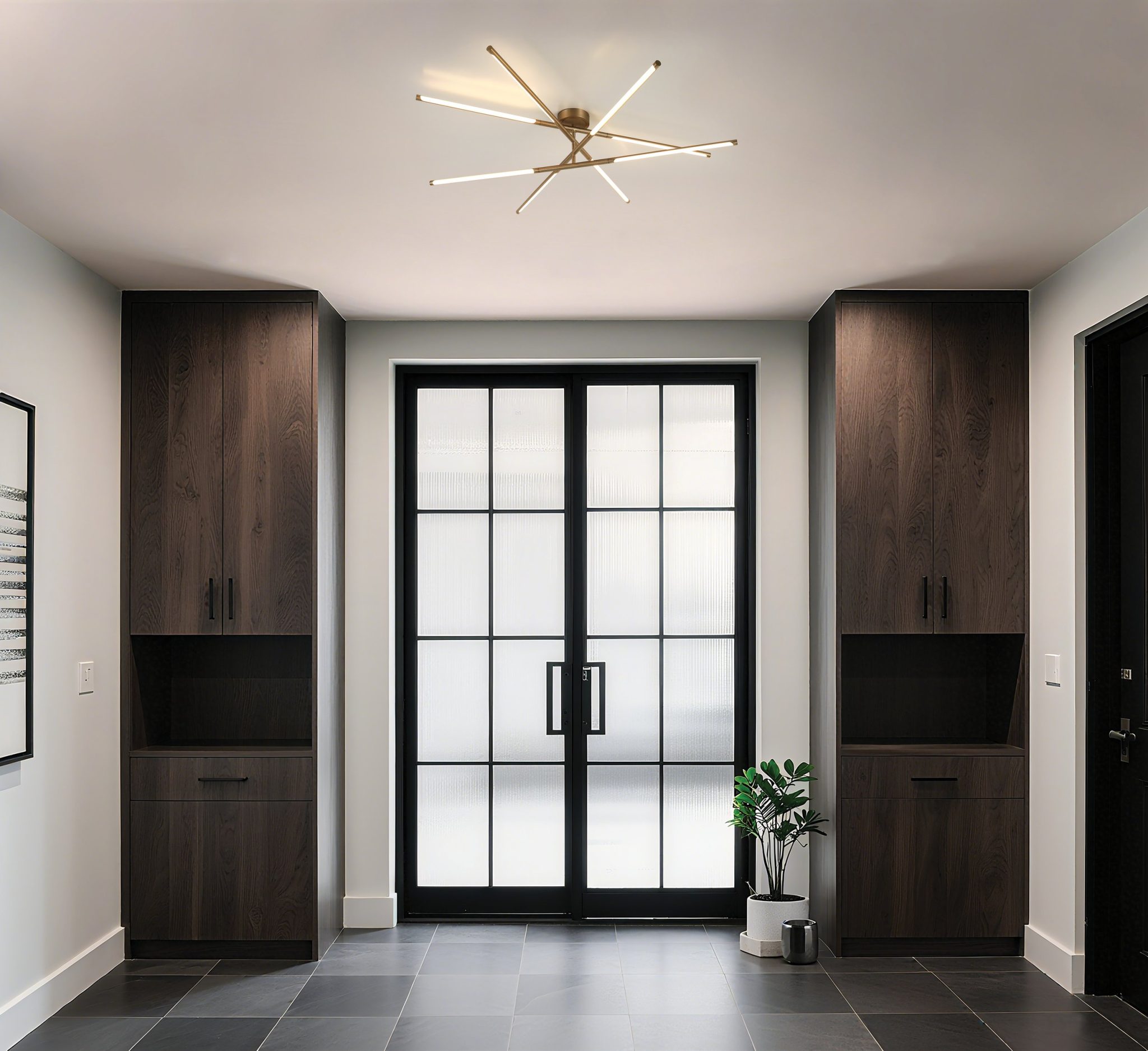 Le lustre Overture en or champagne s’inspire de la fluidité des baguettes de chefs d’orchestre et propose un équilibre subtil entre luxe minimaliste et expression sculpturale. Ses bras longs et ajustables sont équipés d’éléments DEL 5CCT orientables à chaque extrémité, offrant une liberté totale pour composer la lumière. Un détail martelé au centre des bras, repris sur la canopée, ajoute une brillance délicate qui rehausse l’élégance sculpturale du luminaire.