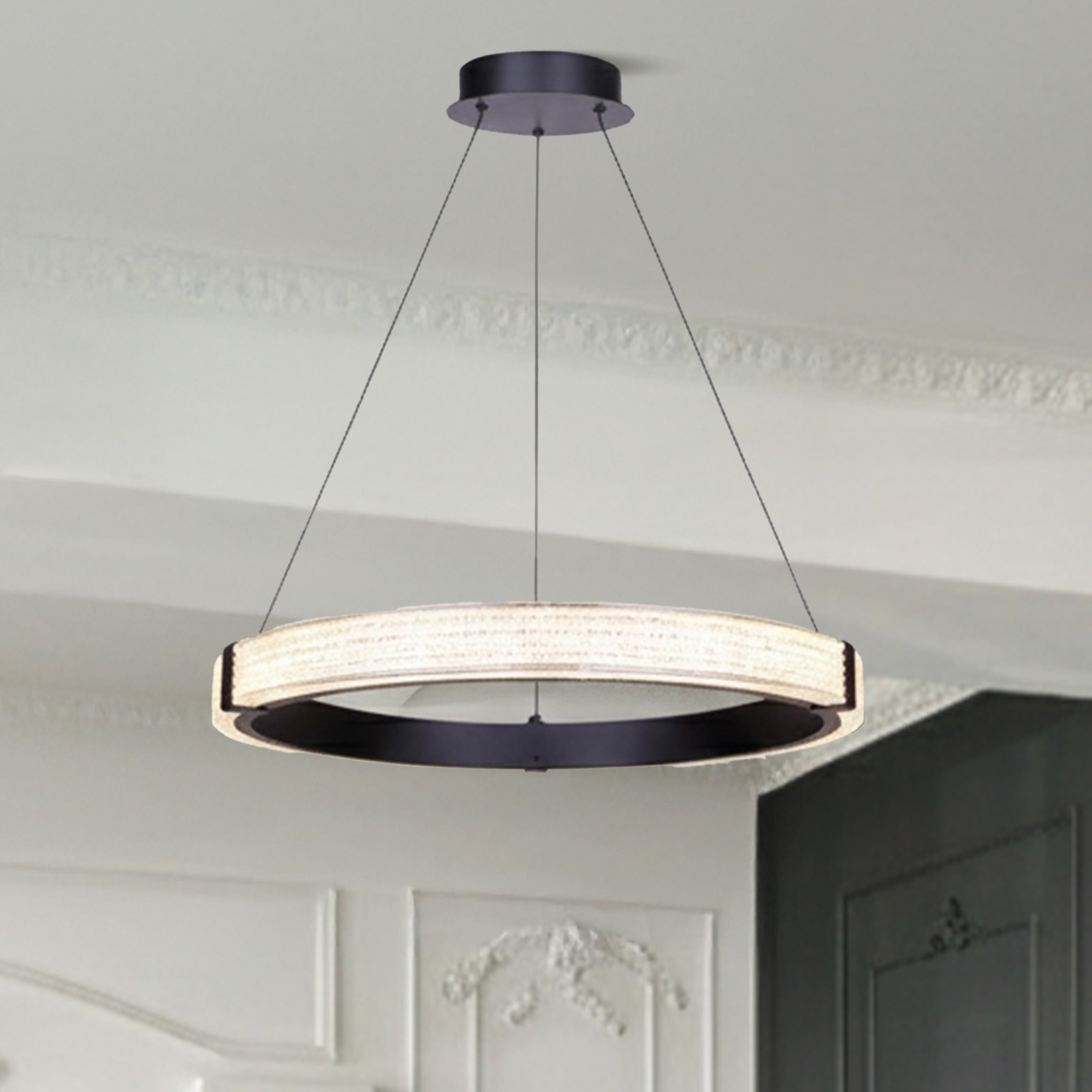 Le lustre SOLACE LED apporte une touche de glamour sophistiquée aux intérieurs contemporains. Sa structure noire mate et sa forme circulaire sculpturale dégagent une présence sereine et affirmée, à la fois audacieuse et équilibrée. L’abat-jour en acrylique reflète la lumière d’une manière qui rappelle le cristal serti ou la joaillerie fine, offrant un chatoiement subtil, raffiné et discret. L’éclairage LED intégré diffuse 2 000 lumens d’une lumière douce et homogène, réglable grâce à un interrupteur 3CCT (3 000 K, 4 000 K, 5 000 K) avec variateur. Avec une hauteur ajustable de 51 à 161 cm, SOLACE s’intègre harmonieusement aux salles à manger, aux salons ou aux entrées qui recherchent une ambiance feutrée et élégante. La géométrie épurée et les détails lumineux incarnent le luxe moderne dans toute sa splendeur.
