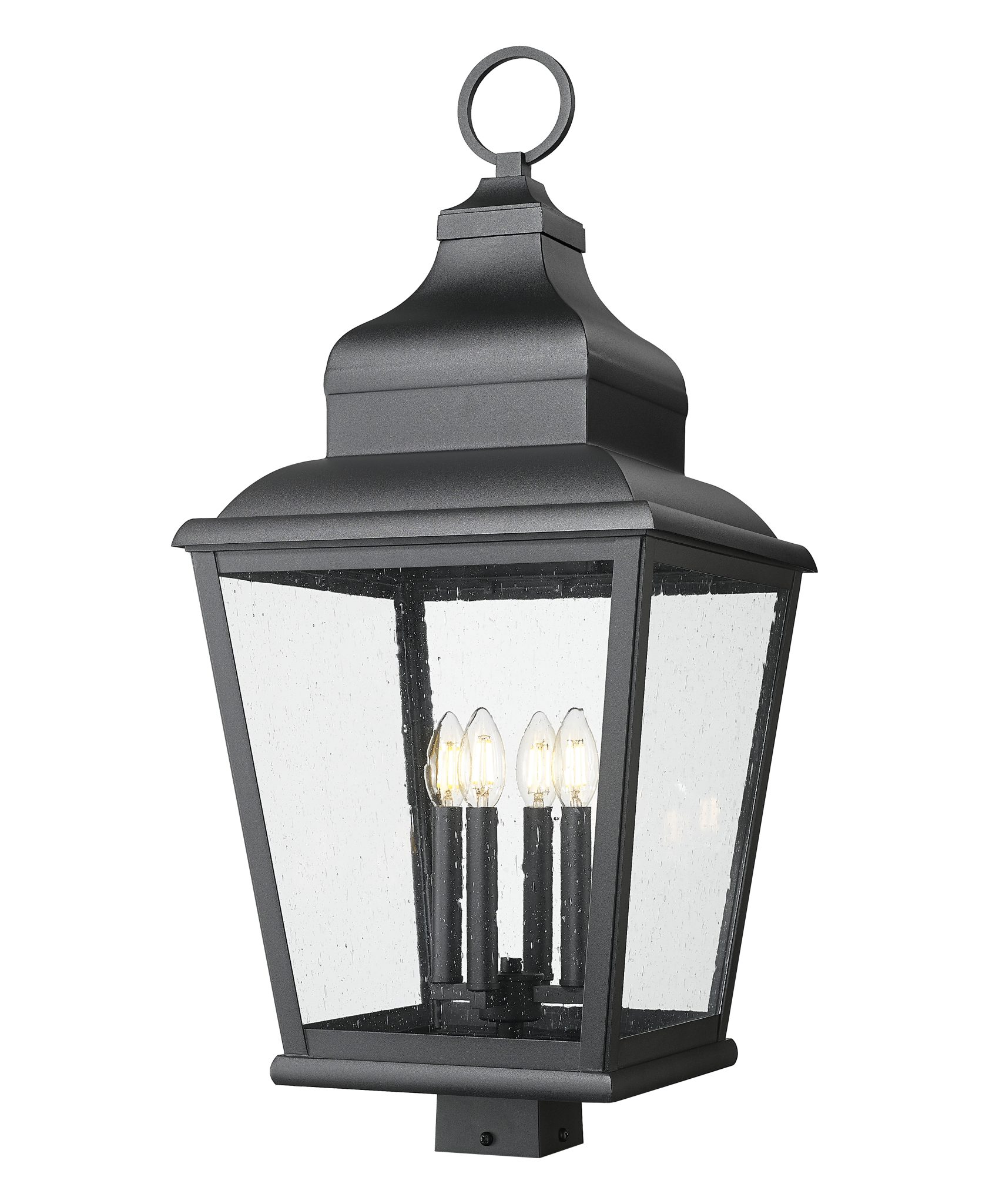 Avec son toit haut et richement orné et ses panneaux de verre clair à bulles, ce luminaire extérieur sur poteau à quatre lumières crée une ambiance villageoise pittoresque dans les espaces résidentiels et commerciaux. La finition en aluminium noir sable doux confère à ce luminaire légèrement conique un aspect de lanterne. Les supports d’ampoules groupés, évoquant des bougies, apportent une touche de charme et permettent un éclairage à intensité variable.